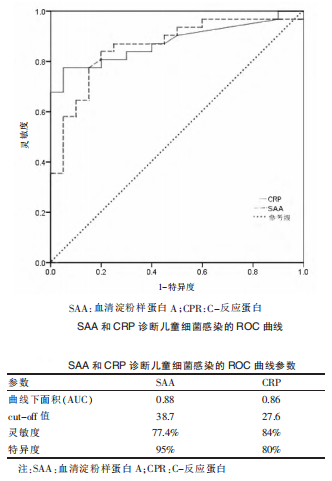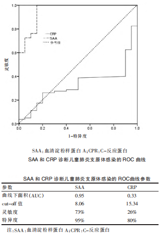 李攀等[3]探討血清淀粉樣蛋白A(SAA)和C-反應(yīng)蛋白(CPR)檢測對兒童支原體肺炎的診斷價值。包括支原體感染患兒124例(支原體感染組)、細(xì)菌感染患兒35例(細(xì)菌感染組),同期健康體檢兒童20例(對照組),分別測定和分析三組SAA和CRP水平,并應(yīng)用ROC曲線進(jìn)行分析。結(jié)果表明:SAA檢測對診斷兒童肺炎支原體感染和細(xì)菌感染的準(zhǔn)確性均較高;CRP檢測對診斷兒童細(xì)菌感染準(zhǔn)確性較高,但對于鑒別診斷兒童肺炎支原體的意義較小。SAA 檢測可用于兒童肺炎支原體感染的鑒別診斷,應(yīng)在臨床中廣泛應(yīng)用。